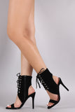 These stylish open toe silhouette, lace up front, cutout design with corset detail at the back, velvet fabrication, low platform, pointed metal aglets, and wrapped stiletto heel. Finished with cushioned insole and side zipper closure for easy on/off.