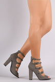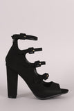 This fashionable heel features a peep toe silhouette, ladder-style straps with an adjustable buckle accent, and wrapped thick heel. Finished with a lightly padded insole and convenient back zip closure.