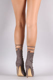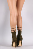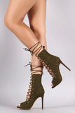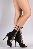 These sexy high heel boots features a lace up front with extra long laces to wrap around your ankle, small platform, peep toe silhouette, and a thin stiletto heel, finished with a lightly padded insole for comfort.