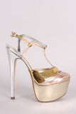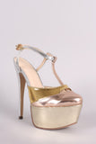 This stylish T-strap pump features a metallic colorblock vegan leather, almond toe silhouette, chunky platform, and wrapped stiletto heel. Finished with a lightly padded insole and adjustable ankle strap with buckle fastening.