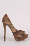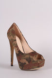 This versatile pump features a camouflage print vegan suede upper, peep toe silhouette, partially hidden platform, and wrapped stiletto heel. Finished with a lightly padded insole and easy slide style.