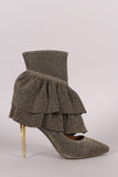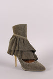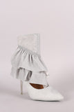 These eye-catching pointy toe silhouette, cutout design with beautiful ruffle detail on the vamp, and lucite stiletto heel. Finished with a lightly padded insole, vegan leather lining, and side zipper closure for easy on/off.