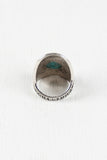 A wide armor ring with a drop-shape faux turquoise stone center and stylized floral designs in glossy enamel.