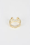 This ring features a high polished gold tone finish, faux stacked look, 3 different textured bands, one open ended with two cubes. Non adjustable.