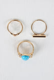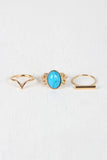 This ring set features three different styles, one turquoise stone ring, one arrow ring, and one bar ring. Finished with a high-polished gold-tone frame.