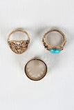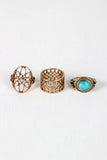 This ring set features three different bands, One floral cutout detail band, one wide band with mirroring crown cutout, and one with faux turquoise stone. Non-adjustable.