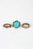 This ring set features three stylish bands. One big faux stone, one deep etched ring, and one with three etched domes detail. Non-adjustable.
