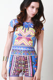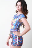 This romper features smooth stretch fabric, tribal print, round neckline, cap sleeves, and deep scoop back. Accessories sold separately. Made in USA. 95% Polyester, 5% Spandex.