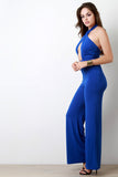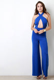 This daring jumpsuit features a smooth stretchy knit fabric, crisscross band chest design, open back construction, and halter neckline. Finished with a wide leg, relaxed fit bottoms, and button hook closure at nape. Accessories sold separately. 95% Polyester, 5% Elastane.