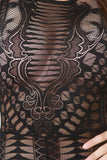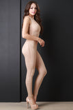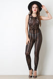 This alluring jumpsuit features semi-sheer lace, round neckline, sleeveless construction, taper cut legs, and finished with back zipper closure. Accessories sold separately. Made in USA. 90% Nylon, 10% Spandex.