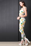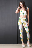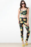 This two piece set features fun pineapple pattern print throughout, sleeveless, crop top with self-tie shoulder straps, ruched sweetheart neckline, and padded cups. Bottoms features an elasticized high rise waist, and sculpture taper cut fit. Accessories sold separately. Made in U.S.A. 96% Polyester, 4% Spandex.