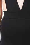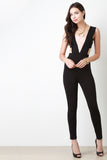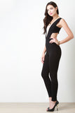 This trendy jumpsuit features a stretchy knit fabric, deep v-neckline with mesh panel, side-to-back cutout, and wide shoulder straps. Finished with a back zipper fastener and taper-cut legs. Accessories sold separately. Made in U.S.A. 65% Rayon, 30.5% Nylon, 4% Ponti.
