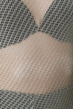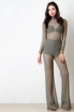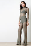 This daring jumpsuit features a sheer lace fabric, mock neckline, long sleeves, and wide leg cut bottoms. Finished with a double button hook closure at nape and boxer shorts underlay. Accessories sold separately. Made in U.S.A. 96% Nylon, 4% Spandex.