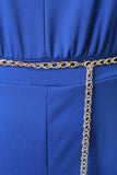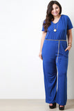 A smooth plus size jumpsuit featuring a rounded v-neckline, short sleeves, and straight leg bottom. Finished with keyhole back, round button closure at nape, and side pockets. Includes glossy curb link chain belt with tasseled end and adjustable lobster hook closure. Other accessories sold separately. Made in U.S.A. 95% Polyester, 5% Spandex.
