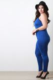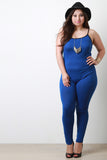 This fitted plus size jumpsuit features a soft marled knit fabrication, scoop neck with contrast spaghetti shoulder straps, sleeveless construction, and taper cut legs. Accessories sold separately. Made in U.S.A. 95% Polyester, 5% Spandex.