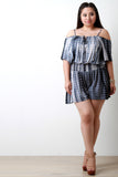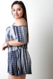This romper features a jersey knit fabrication with tie dye print, cold shoulder with spaghetti straps, and front keyhole with self-tie drawstrings. Finished with a ruffled elasticized waistline. Accessories sold separately. 95% Rayon, 5% Spandex