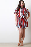 This plus size striped chiffon knit fabrication, pointed collar with button-up front, left chest pocket, short sleeve design, cinched waist, and shorts bottom half. Partially lined. Accessories sold separately. 100% Polyester.