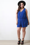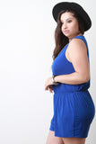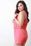 This plus size romper features a zipper adjustable neckline, sleeveless design, elastic waist, knit fabrication, with a wide cut short. Accessories sold separately. Made in U.S.A. 95% Polyester 5% Spandex.