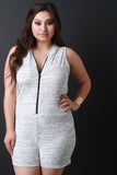 This plus size romper features a soft marled rib knit, sleeveless design, zip-up front with an attached hood, and shorts bottom half. Accessories sold separately. Made in U.S.A. 60% Polyester, 35% Rayon, 5% Spandex.