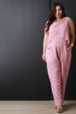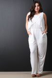This classy plus size jumpsuit features round neckline, chiffon overlapping detail on top, knit fabrication, sleeveless design, elastic waist, front hip pockets, wide legs and back key hole with button closure at nape. Accessories sold separately, 95% Polyester 5% Spandex.