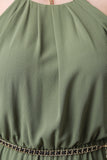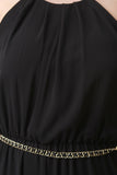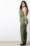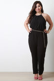 This chic plus size jumpsuit features a sleeveless design, high pleated neckline, woven fabrication, open back design with 3 button closure, elastic waist with an adjustable chain belt, finished with a straight cut leg pant. Accessories sold separately. 100% Polyester.