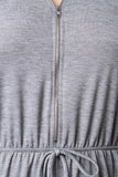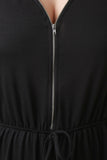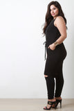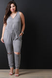This plus size jumpsuit features a knit fabrication, adjustable zippered v neckline, sleeveless design, elastic waist, faux drawstring, front hip pockets, taper cut legs finished with knee slits. Accessories sold separately. 48% Polyester, 48% Rayon, 4% Spandex.