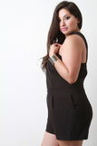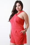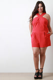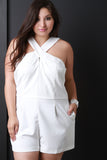This plus size romper features a crossover halter style neck, sleeveless design, two front pockets, and back zip closure. Accessories sold separately. 100% Polyester.