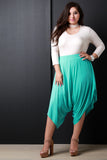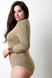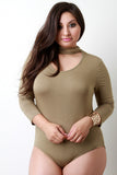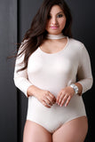 This casual plus size bodysuit features a soft stretchy knit fabrication, front and back keyhole window, choker banded neckline, and three quarter sleeves. Finished with a double snap button at crotch and double button hook closure at nape. Accessories sold separately. Made in U.S.A. 92% Rayon, 8% Spandex.
