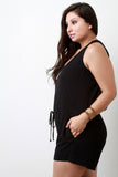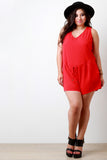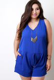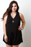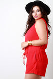 This plus size romper features a textured woven fabric, deep v-neckline, sleeveless fit, and two side pockets. Finished with a surplice back with self-tie lace at nape and self-tie lace at waist. Accessories sold separately. 100% Polyester.