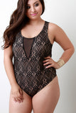 This plus size bodysuit features a lace overlay, scoop neckline with mesh inset detail, and sleeveless construction. Finished with double snap button closure at crotch and full lining. Accessories sold separately. Made in U.S.A. Self: 95% Nylon, 5% Spandex. Contrast: 95% Polyester, 5% Spandex. Lining: 100% Polyester.