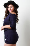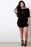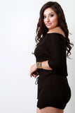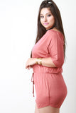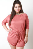 This plus size romper features a jersey knit fabrication, elasticized off the shoulder neckline, dolman elbow sleeves, and elasticized waist with self-tie woven lace. Accessories sold separately. Made in U.S.A. 95% Rayon, 5% Spandex.