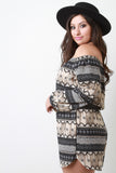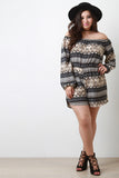 This plus size bardot romper features an elasticized off the shoulder neckline, long sleeves, cinched waist, shorts bottom half, and boho striped print. Accessories sold separately. Made in U.S.A. 100% Polyester.