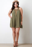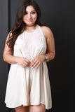 This plus size romper features a high round neckline, semi-sheer plunging mesh yoke, crochet lace trimming, keyhole back and a single button closure at nape. Accessories sold separately. 100% Rayon. Contrast: 100% Cotton.