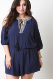 This trendy plus size romper features a textured woven fabric, tribal pattern trimmed v-neckline with self-tie tassel lace, cold shoulder, and elasticized sleeves. Finished with a back triple button hook closure and partial lining. Accessories sold separately. 100% Polyester.