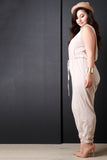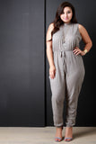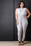 This stylish plus size jumpsuit features a distressed hole pattern design, mock neckline with nape button closure, sleeveless fit, and back opening. Finished with a cuffed hemline and self-tie waist drawstring. Accessories sold separately. Made in U.S.A. 100% Cotton.