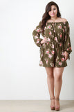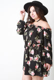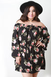 This plus size romper, features an elasticized off the shoulder neckline with a keyhole opening. Designed with an elasticized waist and long sleeves. Textured, semi sheer, unlined. Mixed floral print design throughout. Accessories sold separately. Made in USA. 95% Polyester. 5% Spandex.