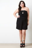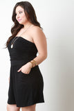 This plus size romper features a jersey knit fabrication, strapless elasticized tube neckline, elasticized ruched side, shorts bottom half, and side pockets. Accessories sold separately. Made in U.S.A. 97% Rayon, 3% Spandex.