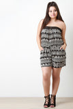 This plus size romper features a paisley printed woven fabric, crochet-trimmed strapless neckline, and two side pockets. Finished with an elasticized back and waist with self-tie drawstrings. Accessories sold separately. Made in U.S.A. 100% Rayon.