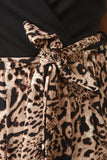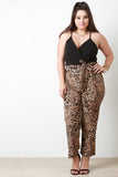 This stylish plus size jumpsuit features a contrasting fabric, surplice v-neckline, thin shoulder straps, and leopard printed bottoms with matching waist sash. Finished with a single button hook closure. Accessories sold separately. Made in U.S.A. Self: 100% Polyester. Contrast: 96% Polyester, 4% Spandex.
