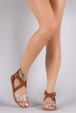 This flat sandal features one band across vamp with texturized snake print, and crisscrossing straps ankle cuff with adjustable buckle closure. Finished with a lightly padded insole for comfort.