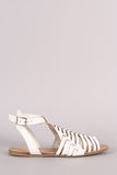 This delightful flat sandal features an open toe silhouette, woven design vamp, lightly padded insole, and adjustable ankle strap with buckle closure.