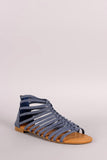 This flat sandal features a nubuck and denim upper, open toe silhouette, and strappy knot-detailed vamp. Finished with a lightly padded insole, and rear zip-up closure.