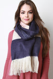 This lovely scarf features a soft knit fabrication, colorblock design throughout, and finished with fringe hem at the end. 100% Acrylic.