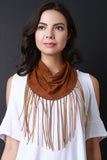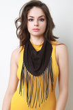 This unique scarf features vegan suede, alternating chain and suede fringe, and self-tie back.