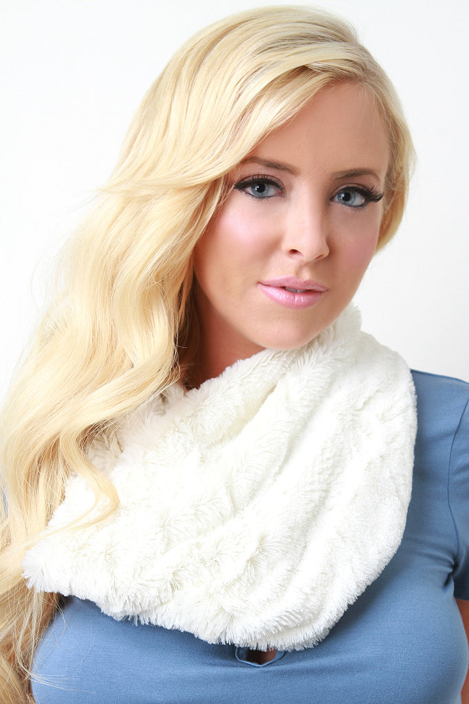 This infinity scarf features a soft faux fur knit fabrication, with a closed end circle scarf constriction.
