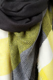 This blanket scarf features a woven fabrication, fringe edges, and a close up plaid pattern. Can be worn as a shawl of over-sized scarf.