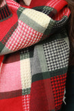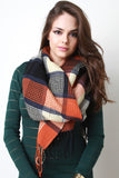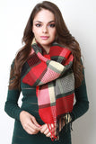 This cozy scarf features a woven fabrication with a plaid pattern, raw edge with twisted fringe at each end.