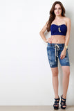 These knee-length shorts feature denim fabric, distressed front and back pockets, elasticized waist with self-tie lace detail, and 4-pocket construction. Accesories sold separately. 100% Cotton.