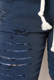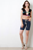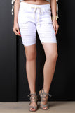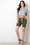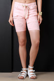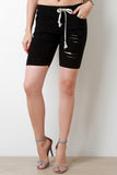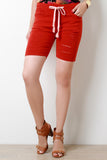 These stylish shorts feature a stretchy knit fabrication, razor-cut details at front and back pockets, 4-pocket design, and elasticized waist band with self-tie lace. Accessories sold separately. 95% Cotton, 5% Spandex.