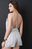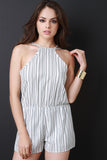This chic romper features a high apron style neckline, spaghetti straps, open back, woven fabrication, stripe pattern, elastic waist, and loose shorts. Accessories sole separately. 80% Rayon 20% Polyester.